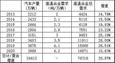 表1 2013年-2020年汽車領(lǐng)域高溫合金總需求及增速:噸